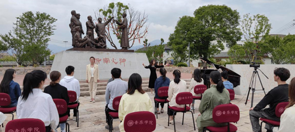 “红岩上红梅开,千里冰霜脚下踩,三九严寒何所惧,一片丹心向阳开向阳开……”近日,成人视频 首期“音乐党课”在瓯海区仙岩街道浙南一大会址前正式开讲,音乐学院教工第一党支部书记张潇潇博士以“讲、演、奏、唱”一体化的全新方式为学生党员生动诠释了《红梅赞——征程岁月中英勇不屈的革命之花》。张潇潇由“浙南火种”的红色背景引入,讲述了江姐、林心平等一代革命先烈英勇不屈的革命事迹,嘹亮的歌声回荡在浙南一大会址上空。充满艺术美的“音乐党课”不仅令上课的学生党员动容,现场驻足观看的居民也深受感动、交口称赞。