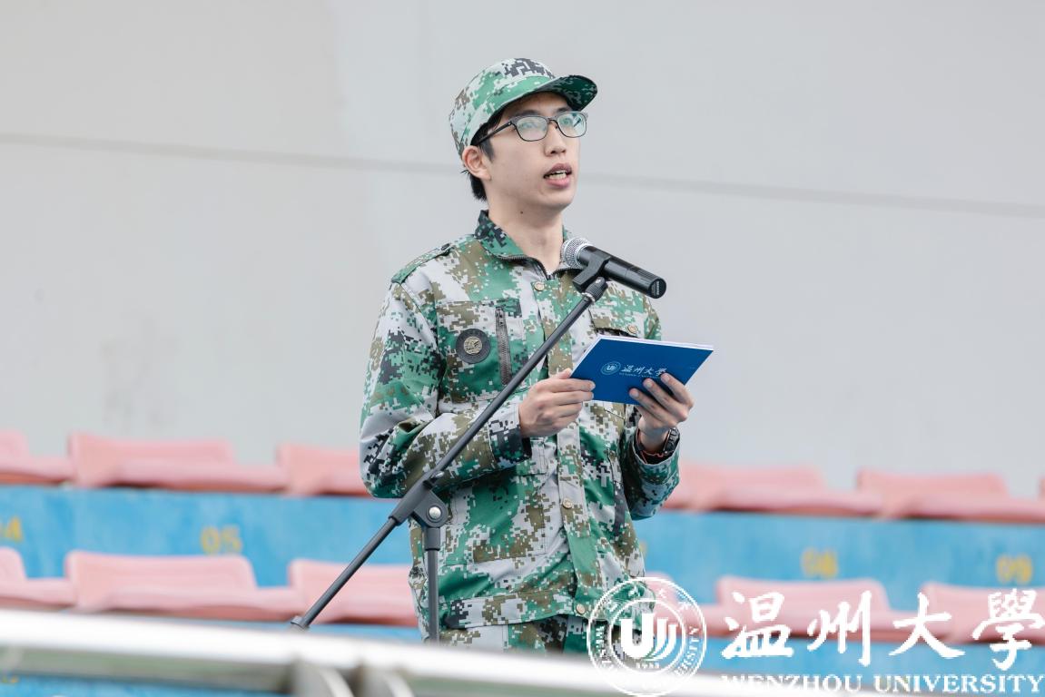 军训学员代表、化学与材料工程学院20化学(师范)1班林铭哲同学代表全体参训学生发言,并做出承诺:将服从命令,听从指挥,努力拼搏,克服困难,严格要求自己,严守军训纪律,全力投入军训,以最佳的精神状态圆满完成军训任务。