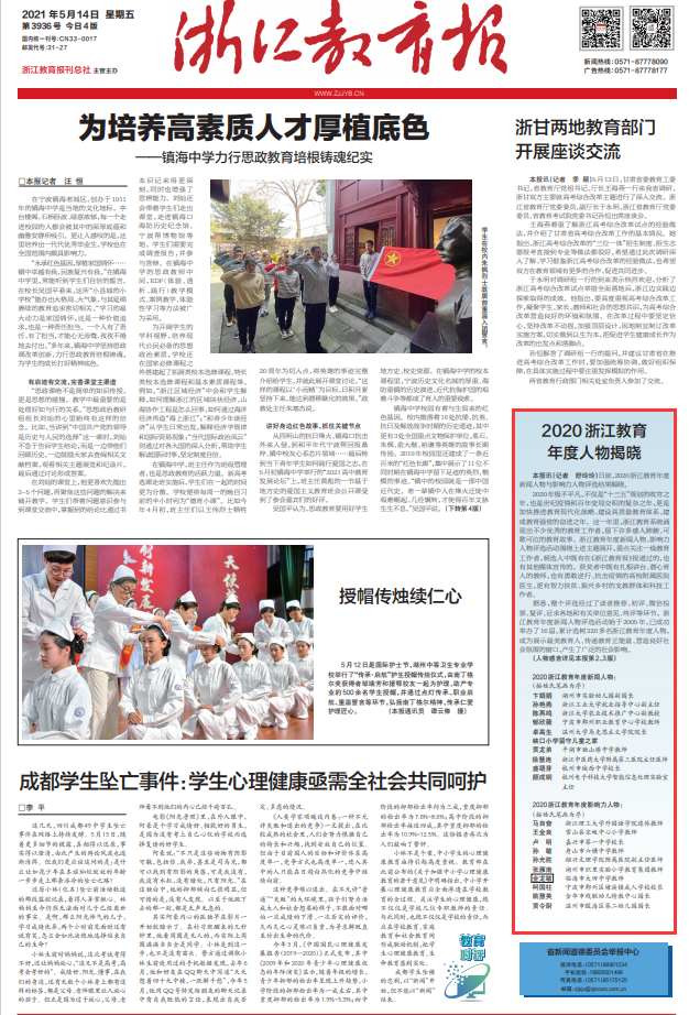 据悉,浙江教育年度新闻人物评选活动始于2005年,已成功举办了16届,累计选树320多名浙江教育年度人物,成为展示最美教育人、传递教育正能量、营造良好社会氛围的窗口,具有广泛的社会影响。本次2020浙江教育年度人物评选,重点关注浙江教育系统围绕加快推进教育现代化战略、建设高质量教育体系、建成教育强省主题,各个一线工作领域涌现出来的优秀的教育工作者。卓高生教授作为思政课教师代表获此殊荣,充分体现了社会各界对于成人视频 思政课教育教学成果的充分肯定,彰显了成人视频 思政课改革与创新在全省教育系统的影响力。