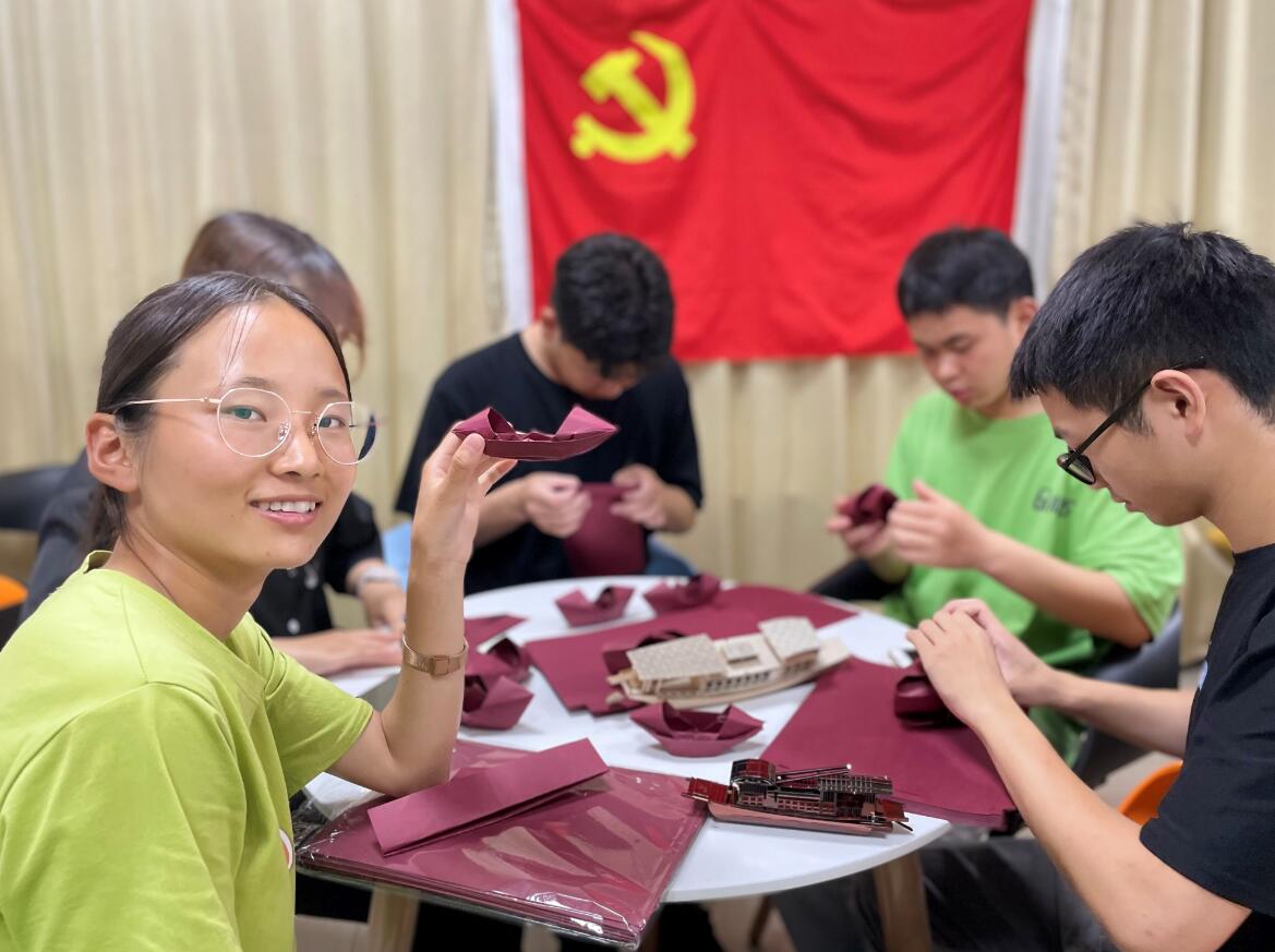 大学生现场折纸制作红船