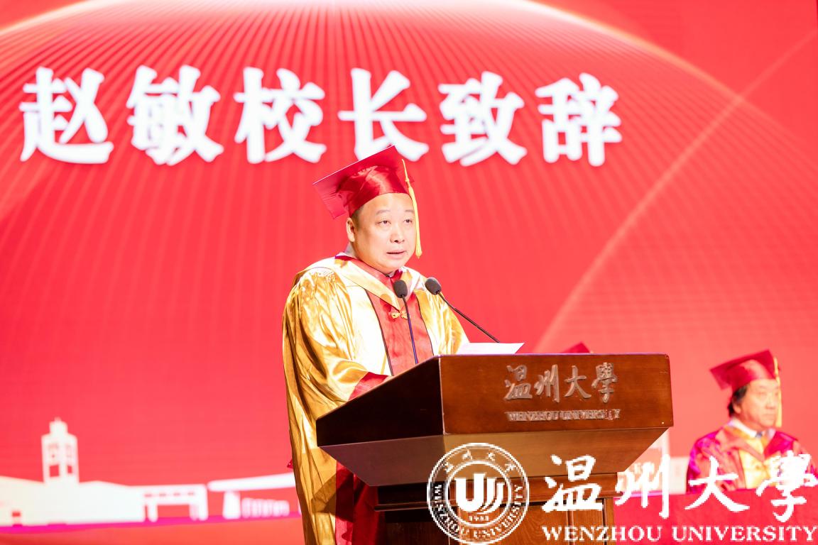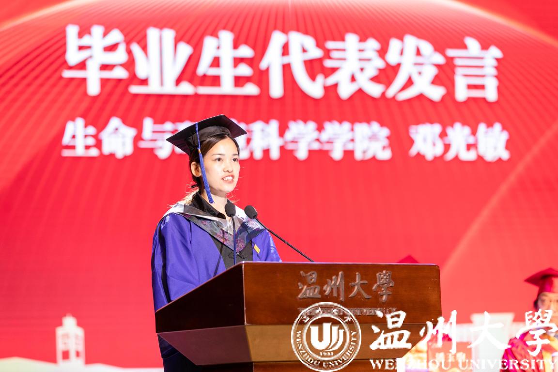 “我们的成长和取得的荣誉离不开母校的培养、老师的教导、同学的帮助,感恩母校,你是每一个温大人心中最美好的回忆。”研究生代表、生环学院的邓光敏同学分享自己读研期间的科研经历,表达了自己对母校衷心的感谢,“我们将时刻谨记温大校训‘求学问是,敢为人先’,不断超越自我,不断攀登向上!”