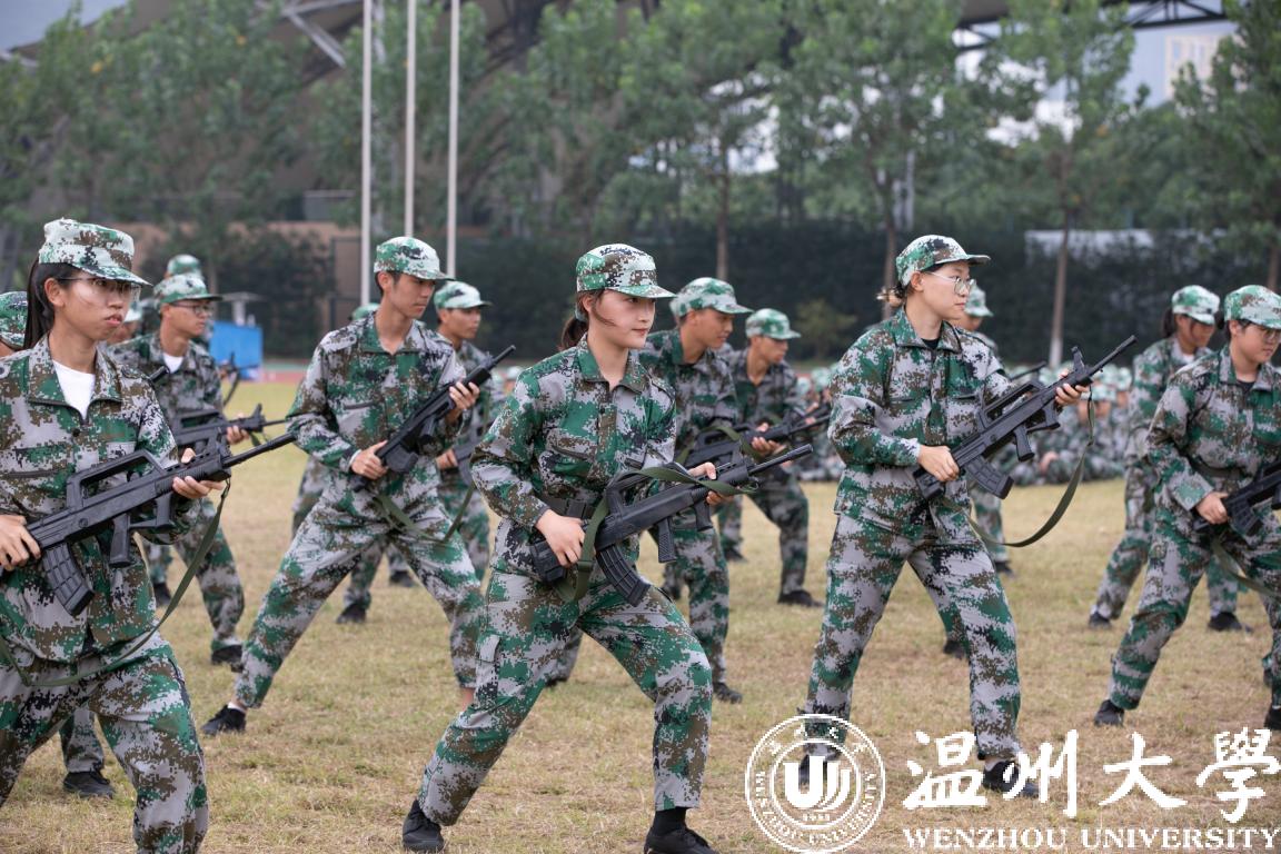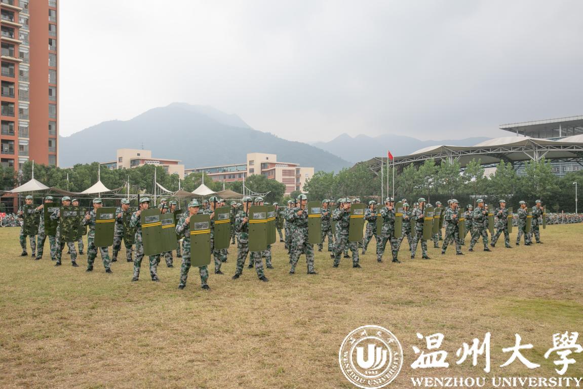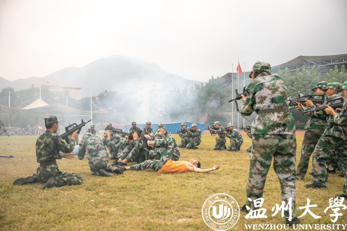 分列式汇报展示阶段,各方阵队意气风发、气宇轩昂,用整齐划一的步伐、铿锵有力的口号通过主席台,彰显了“求学问是,敢为人先”的温大精神。受训学生们展示的刺杀操、捕俘拳、警棍盾牌操、营救方案等表演将大会推向高潮。他们尖刃出鞘,长枪来袭,一招一式敏捷有力,朦胧烟雾中,一道道身影手持枪械,卧倒、匍匐、跪滑……整场表演气势磅礴、震撼人心。