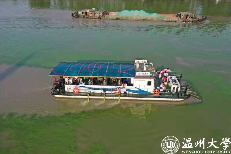 由温大校长赵敏带领团队自主研发的“温大碧晟号”蓝藻水华物理喷射处理船,为攻克世界蓝藻水华治理难题作出贡献。