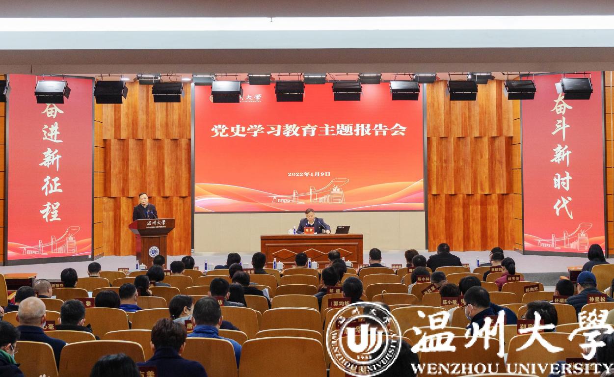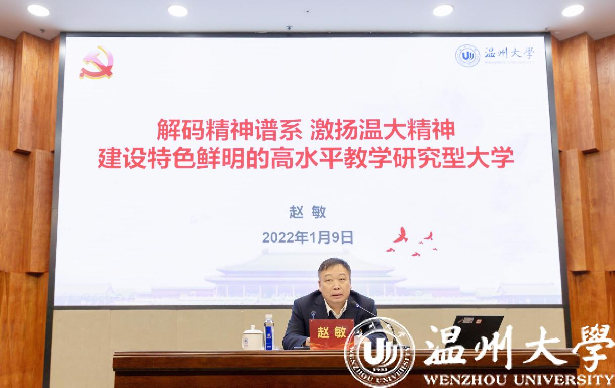 1月9日上午,成人视频 召开党史学习教育主题报告会,校长赵敏以《解码精神谱系 激扬温大精神 建设特色鲜明的高水平教学研究型大学》为题作专题报告。全体校领导、中层干部、教工党支部书记和师生代表参加学习会。党委委员、宣传部部长潘玉驹主持会议。