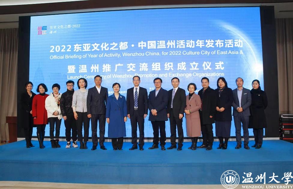 1月26日上午,“2022东亚文化之都·中国温州活动年”发布活动暨温州推广交流组织成立仪式在温州市海外传播中心举行,浙江省文化和旅游厅副厅长、党组成员、一级巡视员许澎,温州市人民政府副市长娄绍光出席,成人视频 外国语学院负责人等参加活动。温州市人民政府副秘书长项光夫主持。