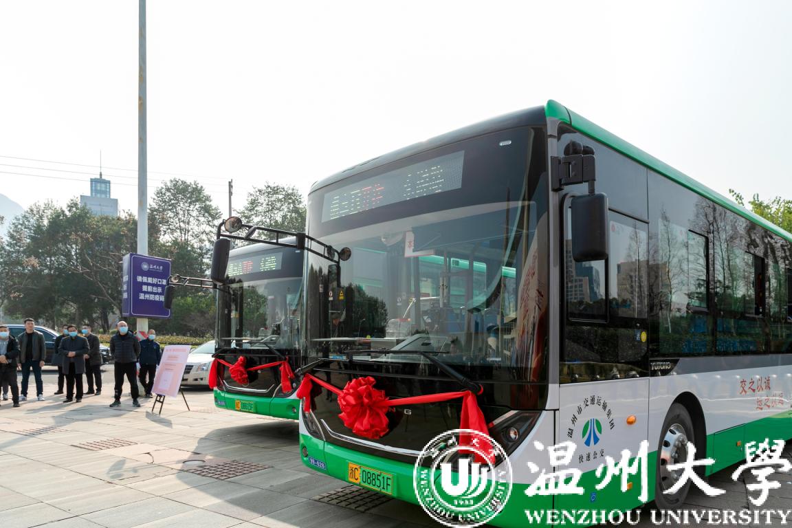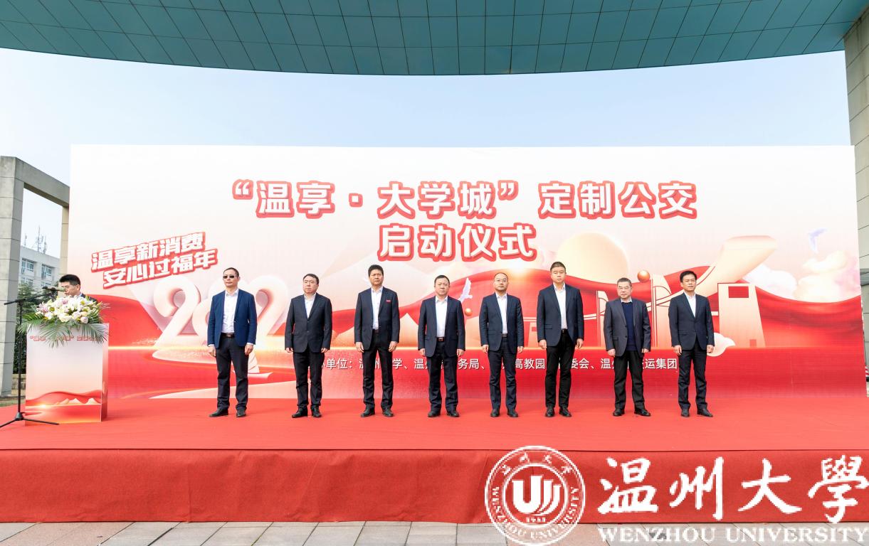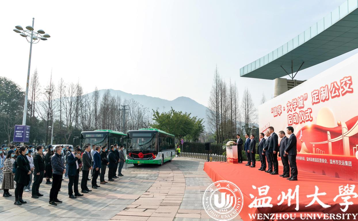 2月27日,“温享·大学城”定制公交启动仪式在成人视频 举行。温州市副市长陈宽、商务局局长彭魏滨、交运集团董事长朱祖荣、校党委书记谢树华、副书记庄兴忠等领导出席活动。