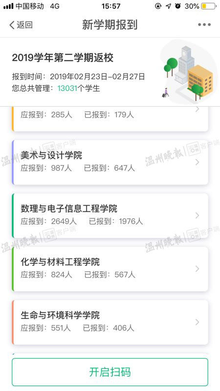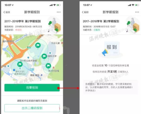 据了解,开学伊始,成人视频 面向全体学生推出“GPS定位”报到系统,学生们线上就能完成报到手续。“操作其实很简单,每一步都有提示,报到只需1步就可以完成。”据成人视频 学生处雷霞老师介绍,“GPS定位”报到的步骤很快捷,拿出手机下载“我的温大”app,在“我的应用”中的“更多”里面,点击“新学期报到”,就能成功完成报到。辅导员老师通过该软件“新学期报到模块”就能轻松掌握学生是否回到了学校,再也不用逐一核对相关证件信息。