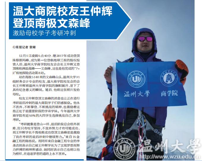 站在海拔5140米的文森峰山头,成人视频 91级财务会计专业的校友、温大商学院校友会的会长王仲辉将成人视频 商学院的旗帜展开,留下了具有纪念意义的瞬间。随后,他将这张照片发给母校。
