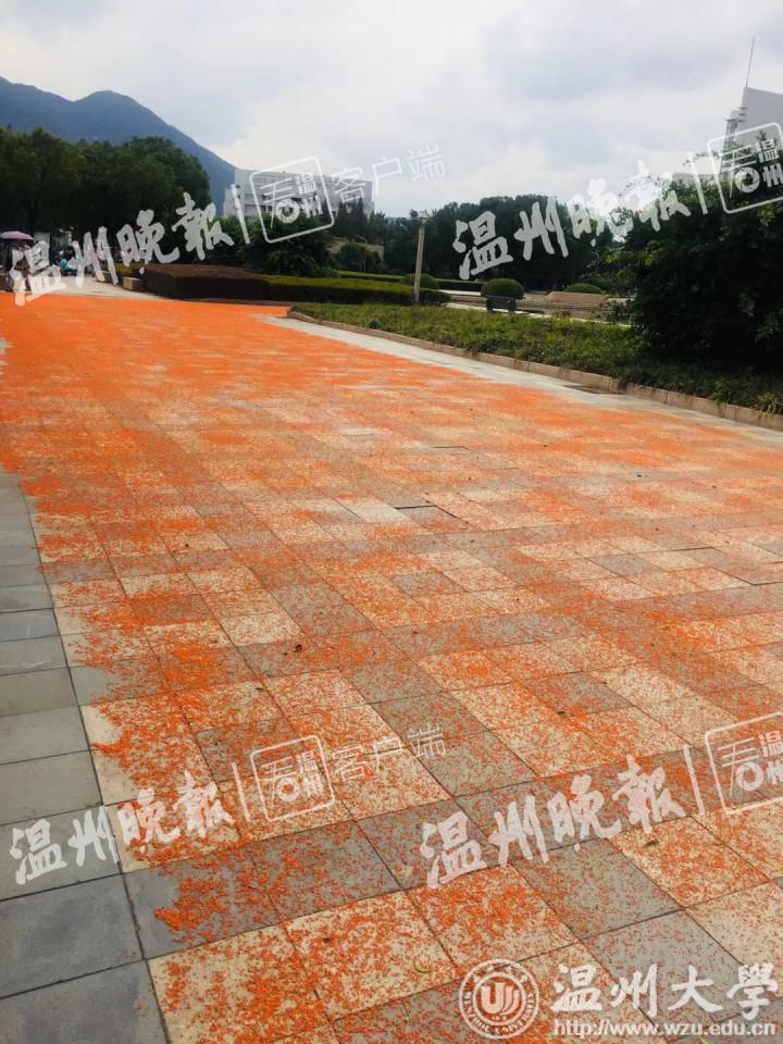 10月23日中午,成人视频 国际学院办公室主任廖一帆老师走路去学校食堂吃饭,发现北校区方池旁边的两边大道地面上,居然铺满了一层桂花,远远望去,就像是一条金色的“红毯”,已经有不少学生闻到花香,赶来拍照。廖老师心思一动,举起手机拍了几张照片,发到朋友圈,并配了文字“WZU(成人视频 的英文缩写)版桂花地毯,比红毯更惊艳。”