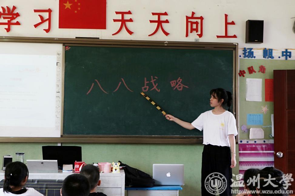 为此,2018年8月1日建军节,在一个声声致敬和慰问伟大而可爱的军人的日子里,成人视频 教师教育学院“知心姐姐”暑期社会实践队的队员们给自己和“小候鸟”们、“小春泥”们准备了一节特别的课程——《八八战略》。