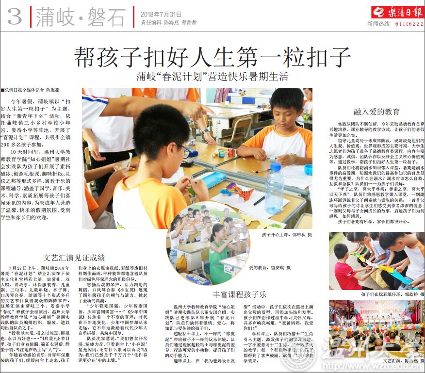 今年暑假,蒲岐镇以“扣好人生第一粒扣子”为主题,结合“新青年下乡”活动,依托蒲岐镇三小乡村学校少年宫、娄岙小学等阵地,开展了“春泥计划”课程,共吸引全镇 200多名孩子参加。10天时间里,成人视频 教 师教育学院“知心姐姐”暑期社 会实践队为孩子们开展了素拓破冰、创意毛根课、趣味折纸、礼仪之邦等形式多样、寓教于乐的课程辅导,涵盖了国学、音乐、美术、科学、素质拓展等孩子们喜闻乐见的内容,为未成年人营造了温馨、快乐的假期氛围,受到学生和家长们的欢迎。
