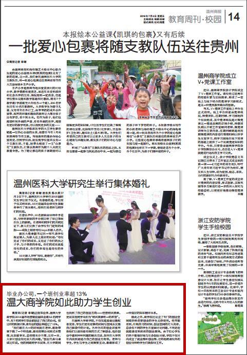 正值毕业季,成人视频 商学院2014届市场营销应届毕业班52名同学 中,有7名同学在毕业前创立了自己的公司。按 这样的数据计算,该专业的创业率超过了13%。 “我们班在大一的时候就在老师、班助带 领下搞了一个特色班,班级按照公司形式来管 理,比如董事长、总经理来分干部,这样一来, 大家对创业有比较大的兴趣。”创业代表马谦 诚这样说。他的同班同学祁汉锋,在大学期间 也找到了自己的创业方向——经营绍兴黄酒, 更被其他同学戏称为“绍兴黄酒唯一的希望”。 在成人视频 商学院,不仅仅是基础设施配 备完善,学生们更有足够的时间与空间去实施 自己脑袋中的计划。各种各样的创业讲座帮 助他们以最快最有效的方式了解创业,包括创 业中遇到种种问题的解决方法,如何在大学四 年内找到最适合自己的创业方向等。老师与 学生,学生与学生之间频繁互动,渐渐形成了 一种良好的知识循环体系。 除此之外,商学院还设立了专门的创业空 间提供给想要创业的学生无偿使用。经常能 看到,在晚自习的时候,创业空间的灯大亮着, 总会有不同的学生在里面讨论问题,不用走近 就能感受到浓浓的创业激情。由于担心学生 仍然不能很好地与社会创业对接,学院不仅对 内成立了就业部和创业部,还特地聘请校外的 创业导师给学生们做指导工作。