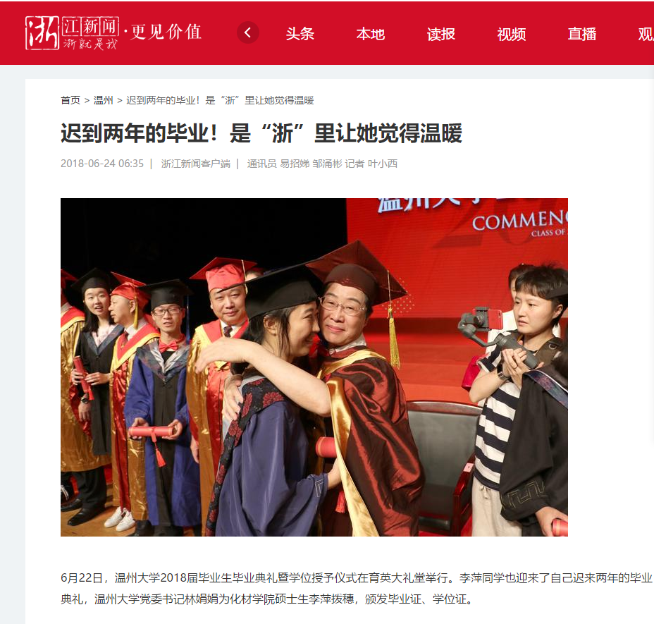 “这个学位证是对我学业上多年努力的肯定,也是我人生中最浓墨重彩的一笔。”拿到学位证书的李萍很是激动。为了能够顺利完成答辩,李萍提前3个月准备毕业论文和答辩书面材料,而学校考虑到她情况特殊,特批通过视频完成答辩。“我很感谢成人视频 老师和同学们对我的关心和帮助,没有你们就没有我的重获新生,真的很庆幸,我来的是浙江温州,读的是温大,‘浙’里让我觉得很温暖!”