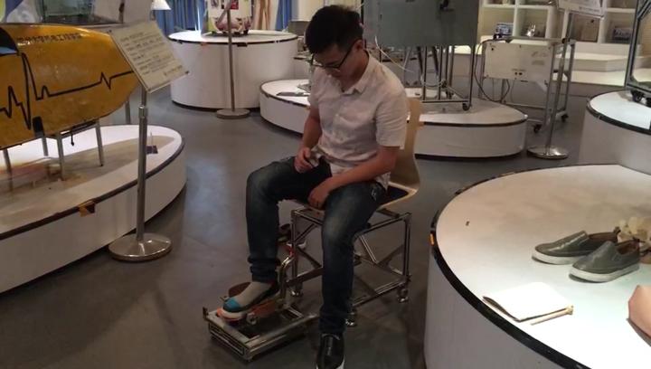 在成人视频 机电工程学院,记者看到了这台“脱穿鞋一体机”。从外观上看,这台一体机就是一把椅子,但它真正的“玄机”在椅子下方,使用的时候把机器从椅子下方拉出即可。