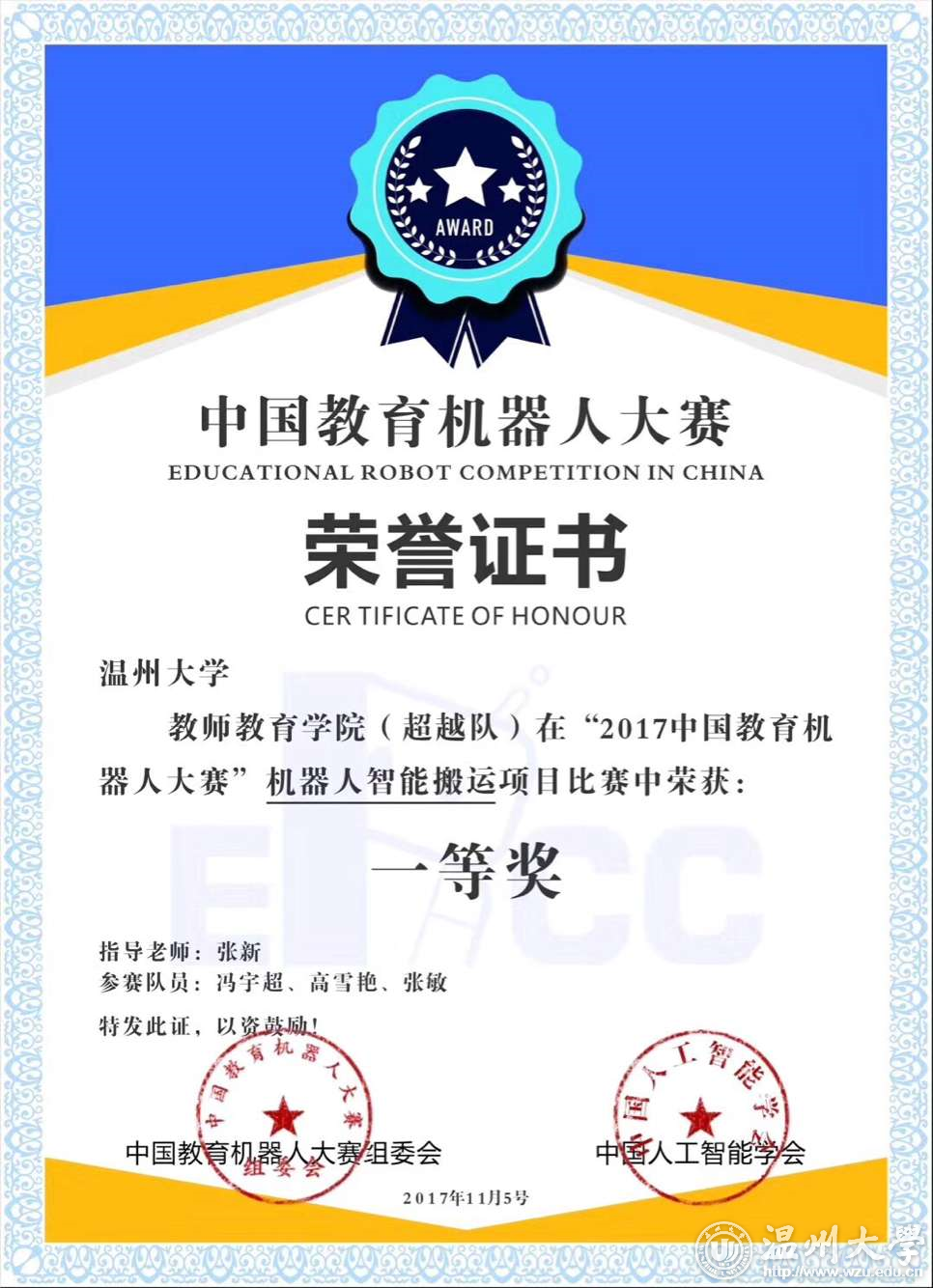 “由于今年参赛队伍多,比赛难度增大,虽然我们已有6年的参赛和获奖经验,但是今年的比赛面临更多新的挑战。在前期准备过程中,我们碰到了许多困难,实验一次次失败,但是我们屡败屡战,耐心地继续试验。”温大教育机器人实验室指导老师张新对学生的出色表现十分感慨而欣慰,“同学们能获得这样的好成绩,很大程度上得利于他们平日里的积极刻苦和勤学多问,一等奖我们实至名归,我为他们感到自豪和骄傲。”队长高雪艳也感慨良多:“这次比赛,让我受益匪浅。平常在机器人实验室老师和学长的帮助指导,让我能学会冷静沉着地面对挑战,积极思考开拓创新。”