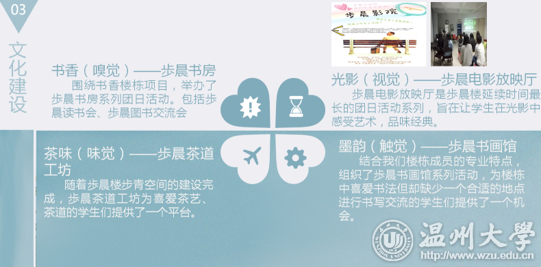 走进步晨楼,一楼“步晨书房”便跃入眼帘,占地约50平米,拥有藏书约2500册,和校图书馆的图书借阅系统同步,学生足不出“区”就可以借阅退换书籍。二楼的步青空间,可以举办书香“嗅觉”(歩晨图书交流会)、光影“视觉”(电影放映厅)、茶道“味觉”(茶道工坊)、墨韵“触觉”(书画馆)为主题的文化大餐,这是步晨楼根据楼栋物电和美术专业女生特点,重点打造“书香满屋”文化项目和“文艺型”楼栋。作为一楼一品建设的缩影,学区的10栋楼,都已形成了自己的特色风格,打造出了自己的楼栋文化项目。