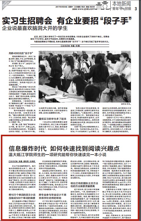在这个信息爆炸的时代,我们每天看到的信息太多了,那么,怎样才能从繁杂的信息里找到自己想读的文字呢?成人视频 瓯江学院师生近日完成的一项名为“基于主题建模的文本小说自动摘要生成算法”的研究,可以帮大家解决这一问题,这项成果不仅被计算机科学与技术学科国际著名学术期刊《专家系统与应用》刊发,还顺利申请了国家发明专利。 将10万个单词的英文小说 压缩成500个单词的摘要 雷力是成人视频 瓯江学院电子信息工程专业2016届本科毕业生,也是这项研究的主要研究者。他说,这项研究成果可以借助计算机代替人工,能够快速地将10万个单词的长篇英文小说,自动压缩为500个单词左右的高质量小说摘要,帮助人们快速了解长篇小说的内容梗概。 在互联网信息爆炸的时代背景,该研究具有重要的现实意义。该研究还申请了国家发明专利,并得到国家自然科学基金的资助。 说起搞这项研究的原因,雷力说,大三暑假,他开始考虑自己的毕业设计。那时,他刚从台湾中华大学以交换生身份学习归来,对“自然语言处理”领域产生了浓厚的兴趣:这是一门融汇了计算机科学、语言学等在内的跨学科领域。他考虑以这个作为自己的毕业设计方向,作为自己迈向这个领域的第一步。 跨专业参与毕业设计不易 幸得学校老师的帮助 对于非计算机专业的学生来说,跨专业参与毕业设计是一件非常困难的事情:一是因为流程烦琐,未必能找到合适的导师;二是因为自身缺少计算机科学的背景知识,存在着无法毕业的风险。但在班主任尤佳的鼓励帮助下,雷力争取到了在计算机科学系答辩的机会。 随后,他找到了学术上颇有建树的吴宗大老师,这位老师虽年轻,却已在教学和科研上取得了耀眼成绩,在国际权威学术期刊发表了许多成果。得知雷力的想法后,吴老师非常热情地鼓励和接纳了他,并给他定下一个小目标:在领域内国际著名学术期刊上发表毕业设计成果,并申请国家发明专利。 相比已有的国际主流方法 他的方法摘要质量更高 定下目标后,雷力开始不断地阅读相关资料。一次,他偶然读到了一篇论文,是利用文本自动摘要技术对小说进行摘要。他想,能不能在保证压缩质量的前提下,进一步提高压缩比呢,比如控制在四五百字?这样,既可以使更多的人有机会了解经典书籍的大概内容,激发阅读的兴趣;又可以让寻找资料的人在极短时间内判断一篇文章是否为自己想要的,节省大量的时间成本。 有了这个想法后,雷力在吴老师的指导下,几乎疯狂地弥补着这块研究的背景知识。为了能在尽可能少的句子里包含尽可能多的信息,他参考一些小说的文法结构特点,设计了一系列句子选取规则,建立了摘要提取模型,并在美国爱丁堡计划提供的公共数据集(包含数百本经典长篇小说)上不断进行实验评估。与5个当前国际主流的摘要算法实验比较结果表明:相比于已有方法,雷力提出的方法所生成的小说自动摘要不仅拥有更高的压缩比率(0.5%以内),并且拥有极高的摘要质量(摘要主题多样性得到显著提高)。 这篇毕业设计获得了成人视频 瓯江学院2016届本科优秀毕业论文。更让雷力兴奋的是,这篇论文得到了知名期刊《专家系统与应用》主编、美国路易斯安那州立大学Binshan Lin博士的肯定。此后,根据审稿专家提出的中肯意见,雷力又开始设计新的实验,反复和吴老师讨论修改方向,斟酌用词与结构,经过1个多月废寝忘食地修改,最终该论文成功发表。 最近,凭借该论文,雷力正积极申请国外名校的研究生,现已得到多个学校的回应。 相关链接: 青年时报://www.qnsb.com/fzepaper/site1/qnsb/html/2017-05/29/content_615393.htm