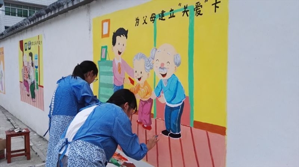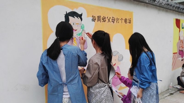 公益墙属于大乌石村中心休闲街外墙,村委会改造后重新粉刷。志愿者现场测量墙面尺寸,各方参与者在空白墙面前纷纷提出墙绘要求和图绘设计,并进行长达5小时孝文化系列的绘制。