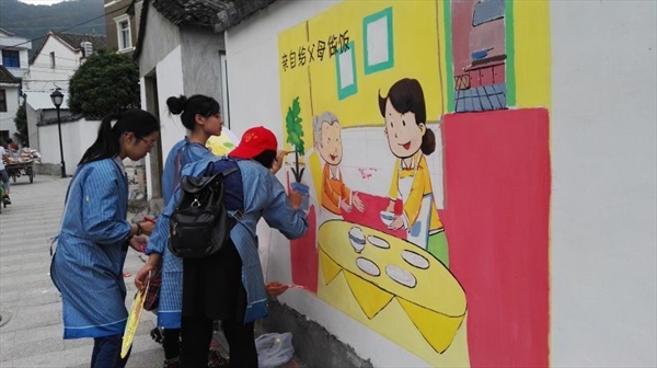 瓯网讯(严晓秋)昨日,由成人视频 教师教育学院和美术与设计学院共同发起“”弘扬传统文化 ,共建美丽乡村”活动再次吹响五四青春的号角。由教师教育学院美术工作坊指导老师陈铿和学生科严晓秋老师带队,30余位学生志愿者,前往乐清虹桥镇大乌石村开展公益墙绘活动。
