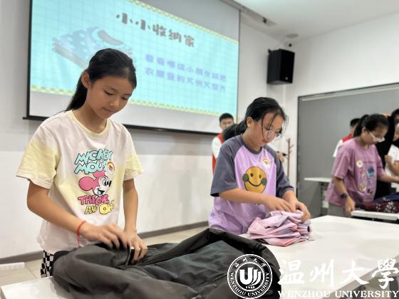 近日,成人视频 建筑工程学院暑期实践队走进东瓯社区,开展“劳动筑童心”主题活动。实践队依托“共享社·幸福里”平台,结合生活实践经验,通过“农夫挑水记”“小小收纳家”“书本回家记”“进桶吧!垃圾”“跳舞的鞋带”等趣味游戏锻炼孩子们的劳动能力和自理能力,让孩子们体会劳动的快乐,在劳动中寻找获得感和成就感。