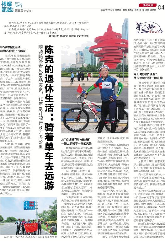2013年,陈克第一次参加骑行活动,目的地是瓯海泽雅。和一群骑友一起出发,沿途随骑随停欣赏风景、品尝美食,让他一下子爱上了这项运动。后来,俱乐部的骑行距离不断拉长至瑞安高楼、青田等地。路程拉长了,兴趣也愈加浓厚了。俱乐部的每一次骑行活动,只要有时间,他都会报名参加。“自行车不仅是一种出行方式,更是一种享受生活的方式。”陈克说,每一次骑行都好像是在跟快乐“赛跑”,跟大自然亲近,很自由、很轻松。
