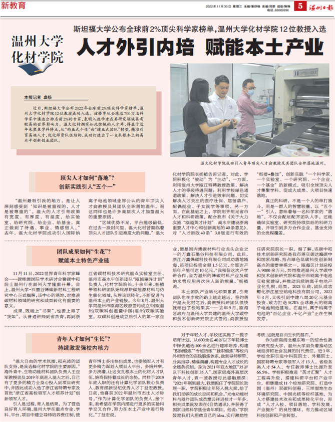在斯坦福大学公布的2022年全球前2%顶尖科学家榜单中,成人视频 化材学院12位教授成功入选。该榜单从全球近700万名科学家中遴选出排名前2%的专家,表明入选学者在其研究领域具有较高的世界影响力。温大化材拥有如此惊艳的人才库,得益于近年来聚焦学科特点,从“钓鱼式个体”向“捕鱼式团队”转型,精准引育高端人才,优化师资队伍结构,成功打造出了一支扎根本土的高水平创新创业团队。