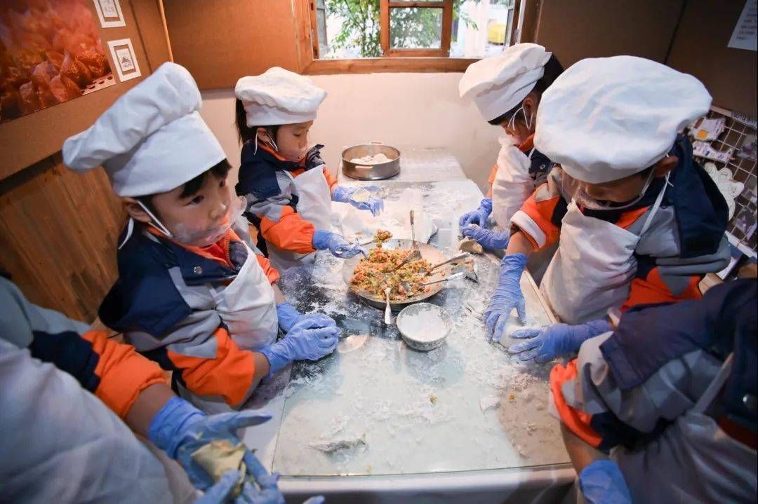 △永嘉县枫林镇中心幼儿园的小朋友们在处理南瓜准备制作当地特色美食“黄馒头”