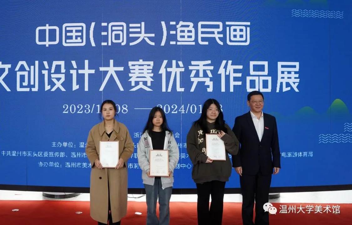 随后,成人视频 党委委员、组织部部长郑信军等领导分别为金银铜奖获奖选手颁发获奖证书,温州市洞头区委宣传部部务成员、文联主席林慷慨为洞头区“艺术乡建”导师们颁发聘书,成人视频 美术与设计学院院长谢子静为学院《渔民画艺术课程》实践导师颁发聘书。最后,领导嘉宾们上台为展览按下触控屏,启动展览开幕。