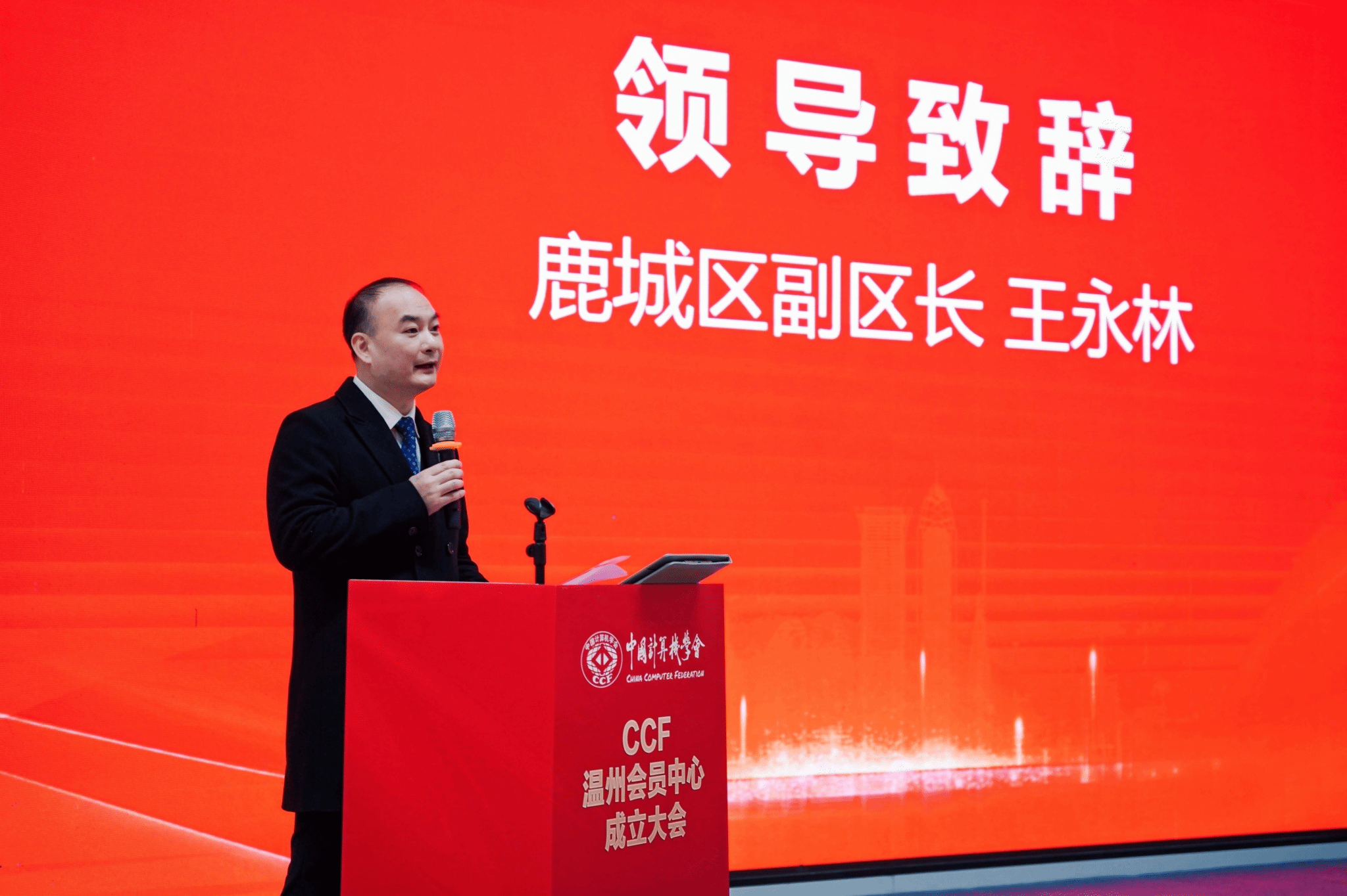 CCF杭州副主席朱霖潮、CCF宁波主席鲍淑娣、CCF金华副主席江晓林等会员活动中心代表上台发表致辞,他们表示非常荣幸能够参加CCF温州的成立大会,与大家共同见证这个重要时刻。