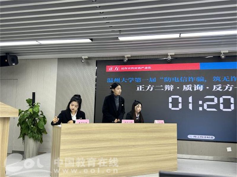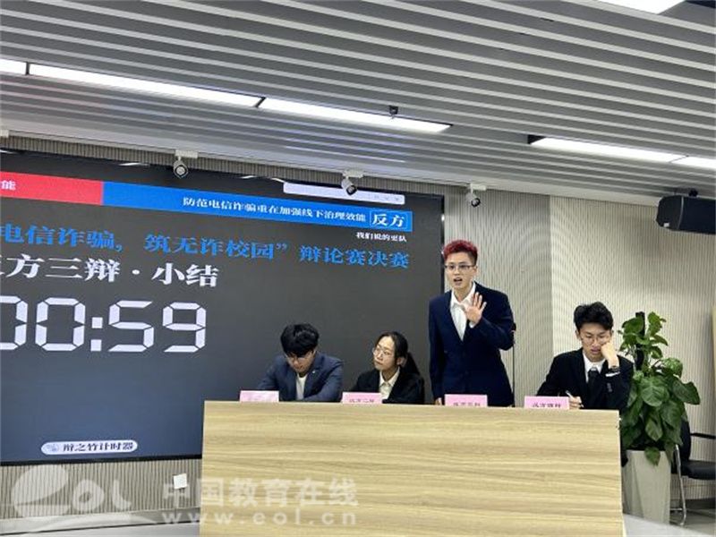 为了增强同学们对辩论的认识,辩论队的“行家”辩手们还特意准备了表演赛。辩论队的正反方,就“反诈宣传应该严肃化还是娱乐化”展开了激烈辩论。双方辩手引经据典,从学生视角对各式各样的防范打击措施慷慨陈词,出其不意地“攻”与“防”给现场同学们留下了深刻的印象。