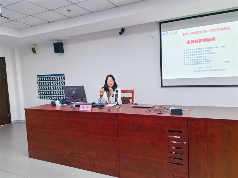 2023年12月21日,成人视频 教育学院教育学系党支部书记、成人视频 家庭教育研究院巾帼文明岗负责人、成人视频 家庭家教家风讲师团团长、浙江省教育学分会副会长、浙江省家庭教育讲师团成员、浙江省妇女儿童发展智库专家、温州市家庭教育学会副会长、温州市家庭和谐文化研究会副会长周奇教授受邀来到温州市妇联干部素质能力培训班,以线下形式为妇联干部做《家庭教育新画像》家庭教育专题分享。