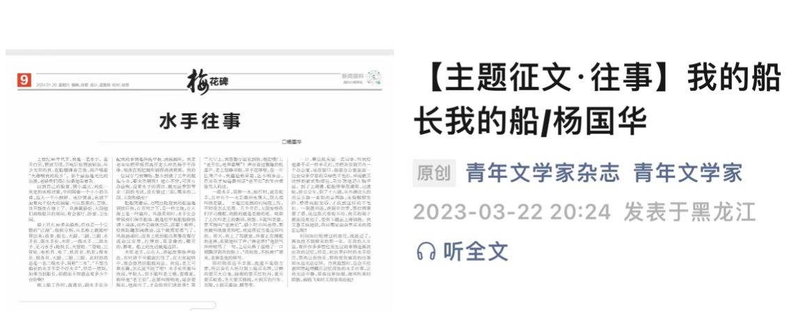 大家都熟知祖籍温州的中国台湾歌手潘安邦的《外婆的澎湖湾》:“阳光、沙滩、海浪、仙人掌……还有一位老船长”。国华在《我的船长我的船》中记录了他的船长力挽狂澜让一船人安全脱险的英勇壮举。老船长韩业广是一位来自北方的转业军人,1米5的厚敦身材,“坚毅的眼神闪烁着星辰的光芒,不怒而威”,大蒜是他的最爱,“熏”的国华至今吃温州拌面都一定以蒜醋相“拌”,老船长爱吃饺子和鸡腿,从来不吃海鲜。“全国劳模在北京开会,聚餐时有一道菜是著名的渤海湾对虾,他却不敢下箸,送给边上一位温州劳模,换了一个大馒头。”