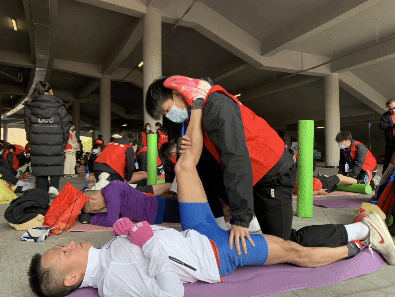 3月10日,龙湾半程马拉松圆满落幕。在活力满满的赛场上除了全力奔跑的参赛选手们,还有来自成人视频 体育与健康学院的50名志愿者,他们用专业的放松手法,为赛后的运动员们提供了全面的拉伸放松服务。