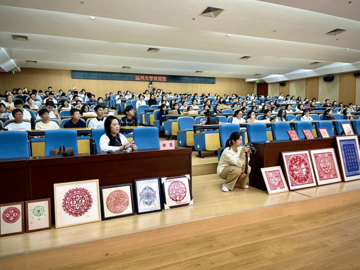 2022年11月,柯娟娥女士开始受聘担任温大教育学院艺术思政教育校外导师,正式将“平阳太平钿剪纸”艺术思政教育课程搬进大学课堂。“平阳太平钿剪纸”作为温州地区特有的传统美术技艺,其表达着老百姓最质朴、最纯真的祝愿,也承载了祖祖辈辈对生活的美好期盼。柯娟娥女士与她的非遗传承团队通过课堂讲授、实践操作、精品赏析、交流分享等生动活泼的教学方式,向青年学子讲述平阳太平钿剪纸的发展历史、现代演绎和情感传递,用艺术之美滋养孩子们的心灵。